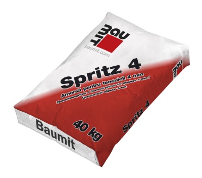 se va aplica pe perete cu mistria. Înaintea aplicării amorsei pentru tencuială Baumit Spritz 4 pe suport puternic absorbant, acesta