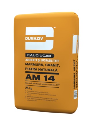Domeniu de aplicare: DURAZIV AM 14 este un adeziv ALB utilizat la interior și exterior, pe bază de lianți minerali cu întărire normală și alunecare redusă, pentru lipirea plăcilor de marmură, granit și piatră naturală, clasa C2T, conform standardului european SR EN 12004 (C2: aderență la tracțiune ≥ 1 N/mm2, maximă; T: alunecare redusă ≤ 0,5 mm N/mm2). Aplicabil în strat de 4-15 mm la: