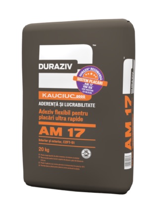 Domeniu de aplicare: DURAZIV AM 17 este un adeziv utilizat la interior și exterior, cu priză rapidă – întărire în cca. 90 min, pe bază de lianți minerali cu întărire rapidă pentru lipirea plăcilor de gresie și faianță tip C1F , conform standardului european SR EN 12004 (C1: aderență la tracțiune ≥ 0.5 N/mm2; F1: întărire rapidă; S1: deformare > 2.5mm, flexibil). Se poate circula pe plăci (trafic uşor) după circa 3 ore şi se poate executa chituirea după 5-6 ore. Aplicabil în strat de 4-10 mm la: