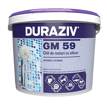 Domeniu de aplicare: DURAZIV GM 59 este un chit de rosturi hidroizolant, realizat din amestecuri de cimenturi speciale aditivate cu silicon, agregate minerale, răşini şi fibre organice, clasa CG2-W conform SR EN 13888 (Mortar de rosturi pe bază de lianți minerali îmbunătățit cu caracteristici suplimentare de absorbție redusă de apă, pentru plăci și dale ceramice: Rezistența la încovoiere Rf ≥ 2,5 N/mm2; Rezistența la compresiune Rc ≥ 15 N/mm2; Contracţie ≤ 3 mm/m; Absorbția de apă Wm≤ 2g după 30 de minute și Wm ≤ 5 g după 240 de minute), recomandat pentru: