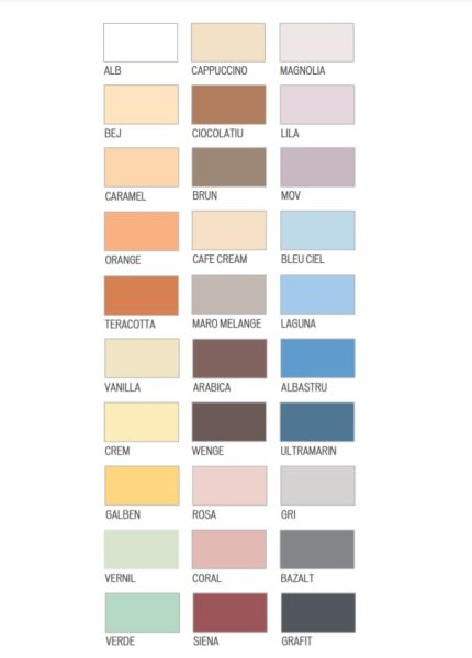 interior şi exterior Culori – 17 nuanțe; 10 nuanțe disponibile în oferta curentă: alb, cappuccino, gri, bej, ciocolatiu, bazalt, caramel, brun, grafit, cafe crem. Și 7 nuanțe disponibile la comandă: crem, arabica, siena, maro melange, wenge, albastru