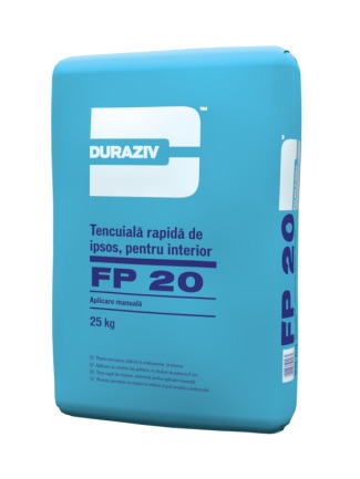 Domeniu de aplicare: DURAZIV FP 20 este o tencuială pe bază de ipsos pentru interior, cu aplicare manuală, tip B2/20/2, conform standardului SR EN 13279-1:2009 (Timp de priză iniţial (timp de lucrabilitate) aprox. 40-60 min; Timp de uscare cca. 24 ore/10 mm grosime; Acoperiri ulterioare dupa 48 ore; Rezistență la temperatură -30°C … +70°C. Clasa de rezistență la foc A1 – incombustibil. Aderență la beton ≥ 0,1 N/mm2.). Se aplică în straturi de 2-20 mm, peste următoarele suprafeţe: