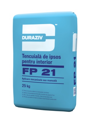 Domeniu de aplicare: DURAZIV FP 20 este o tencuială pe bază de ipsos și var, pentru aplicare la interior, tip B3/50/2, conform standardului SR EN 13279-1:2009 (Timp de priză iniţial (timp de lucrabilitate) cca. 90 min; Timp de uscare cca. 24 ore/10 mm grosime; Acoperiri ulterioare dupa 48 ore; Rezistență la temperatură -30°C … +70°C. Clasa de rezistență la foc A1 – incombustibil. Aderență la beton ≥ 0,1 N/mm2.). Aplicabil mecanizat sau manual, în straturi de 2-20 mm, peste următoarele suprafeţe: