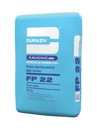Domeniu de aplicare: DURAZIV FP 22 cu Kauciuc® este un adeziv pentru gips-carton cu priză rapidă. Formula pe bază de ipsos, pudre minerale şi aditivi, este destinată pentru fixarea prin lipire a plăcilor de gips-carton, la interiorul clădirilor, conform standardului SR EN 12860:2003 (Timp de priză inițial/lucrabilitate: TL 30-40 minute; Aderență la placa de gips-carton ≥ 0,1 N/mm2; Granulație < 0,4 mm & max. 10% particule ≥ 0,2 mm; Timp de uscare cca. 6 ore/1 mm grosime). Pasta adezivă obținută se aplică în straturi de 4-20 mm, pe următoarele suprafeţe: