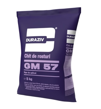 Domeniu de aplicare: DURAZIV GM 57 este un chit de rosturi realizat din amestecuri de cimenturi speciale aditivate, agregate minerale, răşini şi fibre organice, clasa CG-1, confort SR EN 13888 (chit normal, Rezistența la încovoiere Rf ≥ 2,5 N/mm2; Rezistența la compresiune Rc ≥ 15 N/mm2; Contracţie ≤ 3 mm/m; Absorbția de apă Wm≤ 5g după 30 de minute și Wm≤10g după 240 de minute). Recomandat pentru: