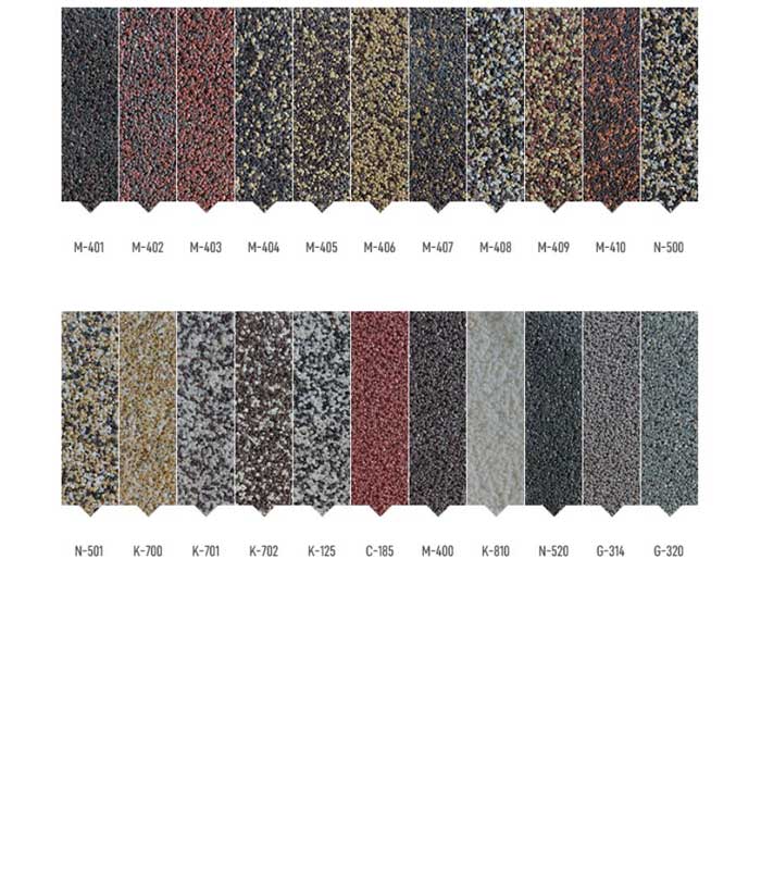Compozitie material: dispersie apoasa acrilo-stirenica, granule de marmura si cuart colorat